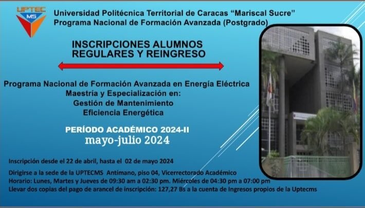A partir de este 22 de abril abiertas las inscripciones Estudiantes Regulares y Reingreso para el Programa Nacional de Formación Avanzada (Postgrado) en Energía Eléctrica, Maestría y Especialización: Gestión de Mantenimiento y Eficiencia Energética.