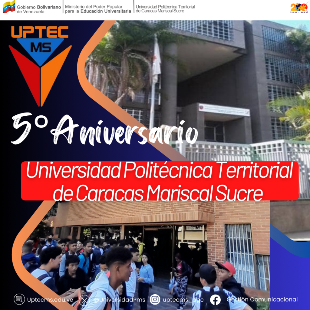 Es asi, como hoy la Universidad Politécnica Territorial de Caracas Mariscal Sucre (UPTECMS), cumple 5 años contribuyendo a la formación integral de las y los venezolanos en las áreas priorizadas del país, brindando una educación pública, de calidad que permita fortalecer el sistema universitario.