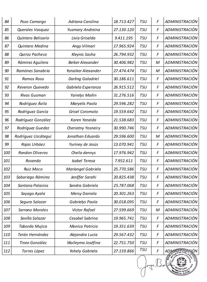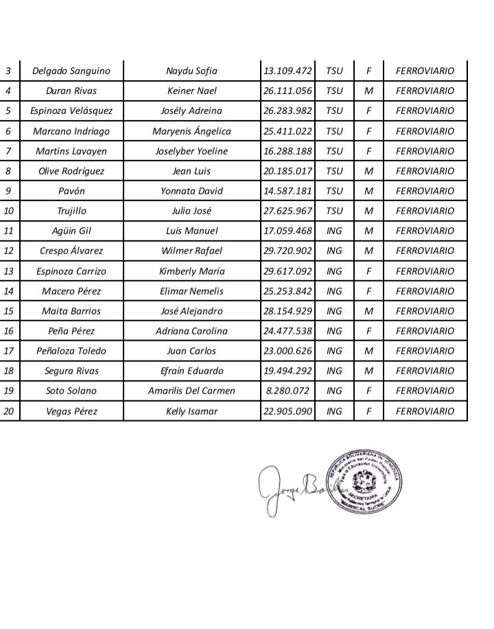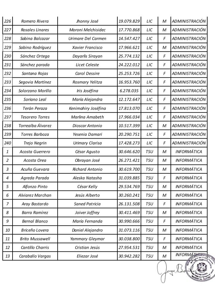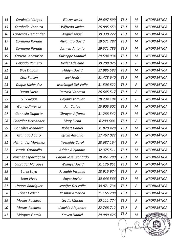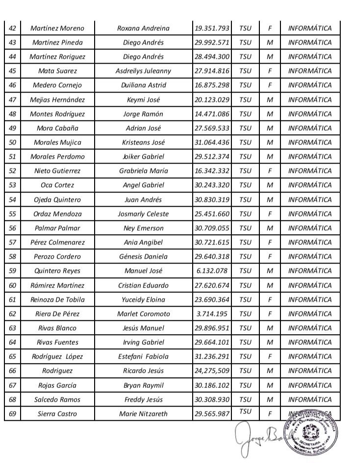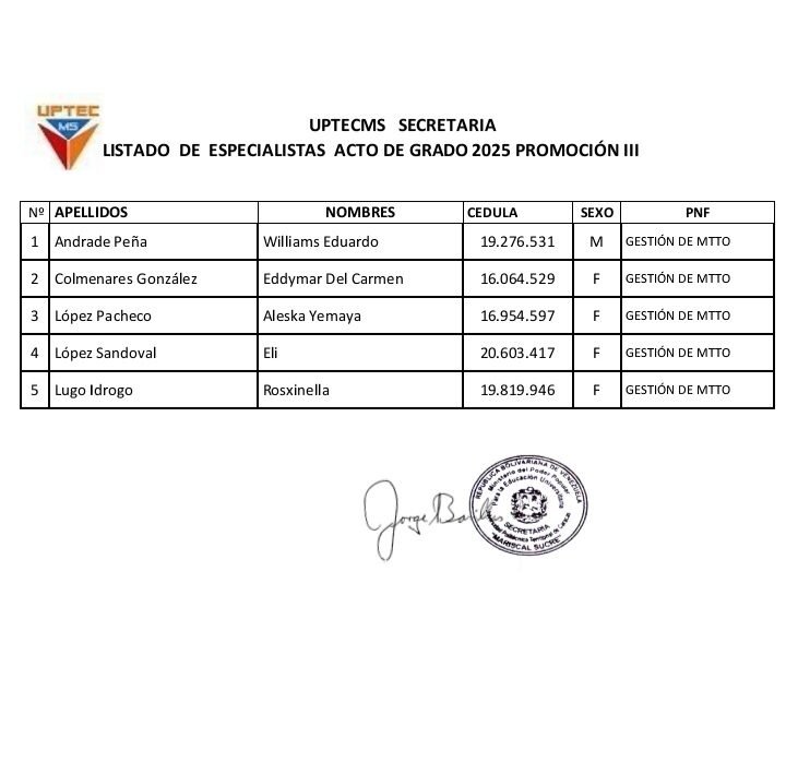 Prensa UPTECMS.- Siguiendo instrucciones del rector MSc. Jaime Márquez, a continuación se publica listado de la VII Promoción de los Programas Nacionales de Formación (PNF) y la III Promoción de Especialistas en Gestión de Mantenimiento de la Universidad Politécnica Territorial de Caracas Mariscal Sucre (UPTECMS)