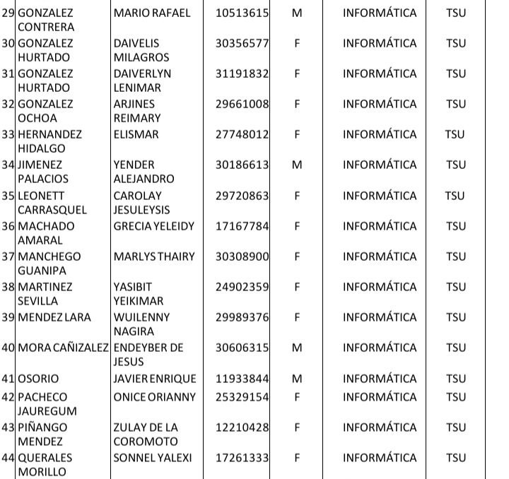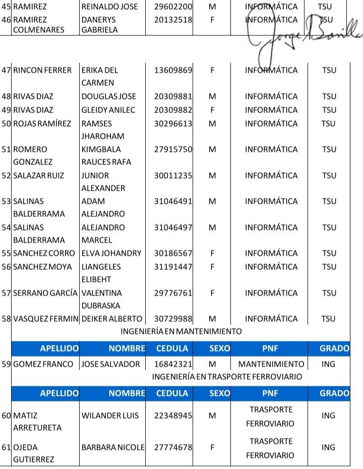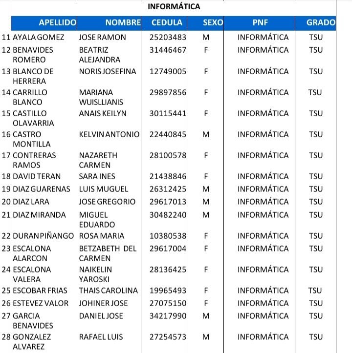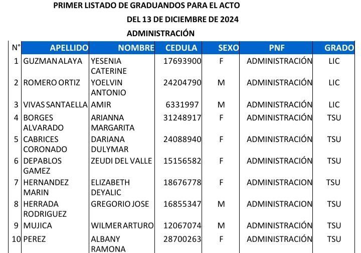De acuerdo a las instrucciones emanadas por la máxima autoridad de la Universidad Politécnica Territorial de Caracas Mariscal Sucre, MSc. Jaime Márquez, se emite y pública listado preliminar de graduandos de la Sexta (VI) promoción de los Programas Nacionales de Formación (PNF) que imparte esta casa de estudios.